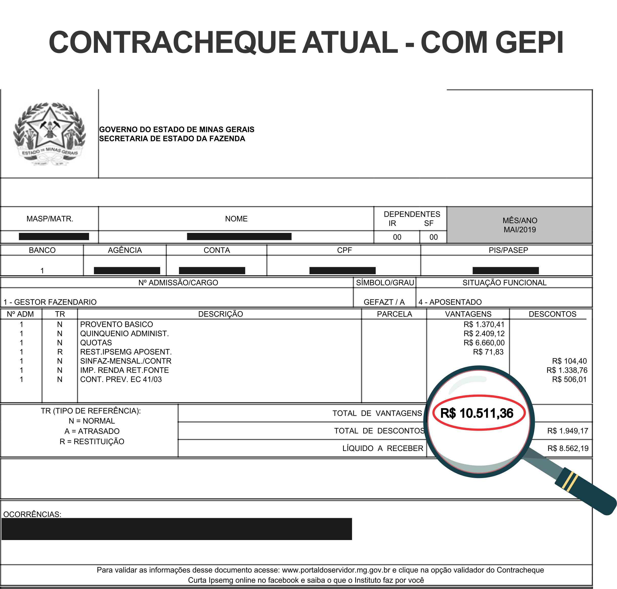 Com efeito, os servidores posicionados no nível T estão recebendo os proventos de aposentadoria a menor, pois, o Estado de Minas Gerais está desrespeitando claramente o direito à integralidade, à paridade e à isonomia, o que vem causando GRAVE PREJUÍZO MENSAL aos mesmos. Para se ter uma ideia, a GEPI devida ao Nível T é de R$ 6.660, relativa à 2000 cotas-GEPI previstas no decreto 46284/13, sobre as quais ainda incidem quinquênios. Esta parte é maior do que o vencimento básico que atualmente recebem. Veja abaixo a diferença de um contracheque sem a GEPI e um contracheque com a GEPI.