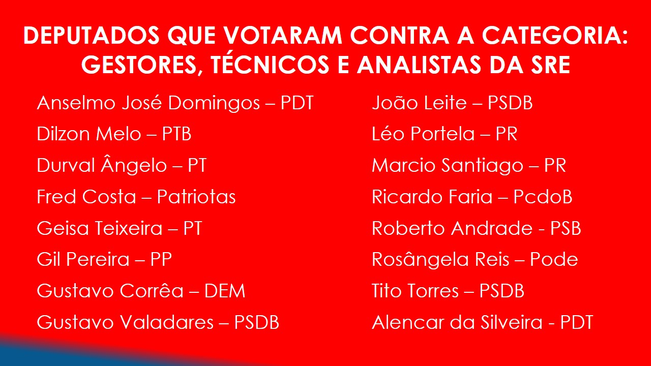 Assim, pedimos aos colegas para contatem os Deputados que votaram conosco nesta caminhada (clique aqui) e os agradeçam pelo apoio irrestrito, mesmo estando sob forte pressão e chantagens de integrantes da cúpula da SEF.